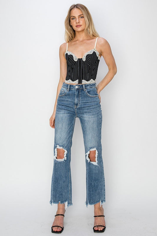 Judy Blue The Eva Mid Rise Medium Wash Straight Jeans with Destroy Detail