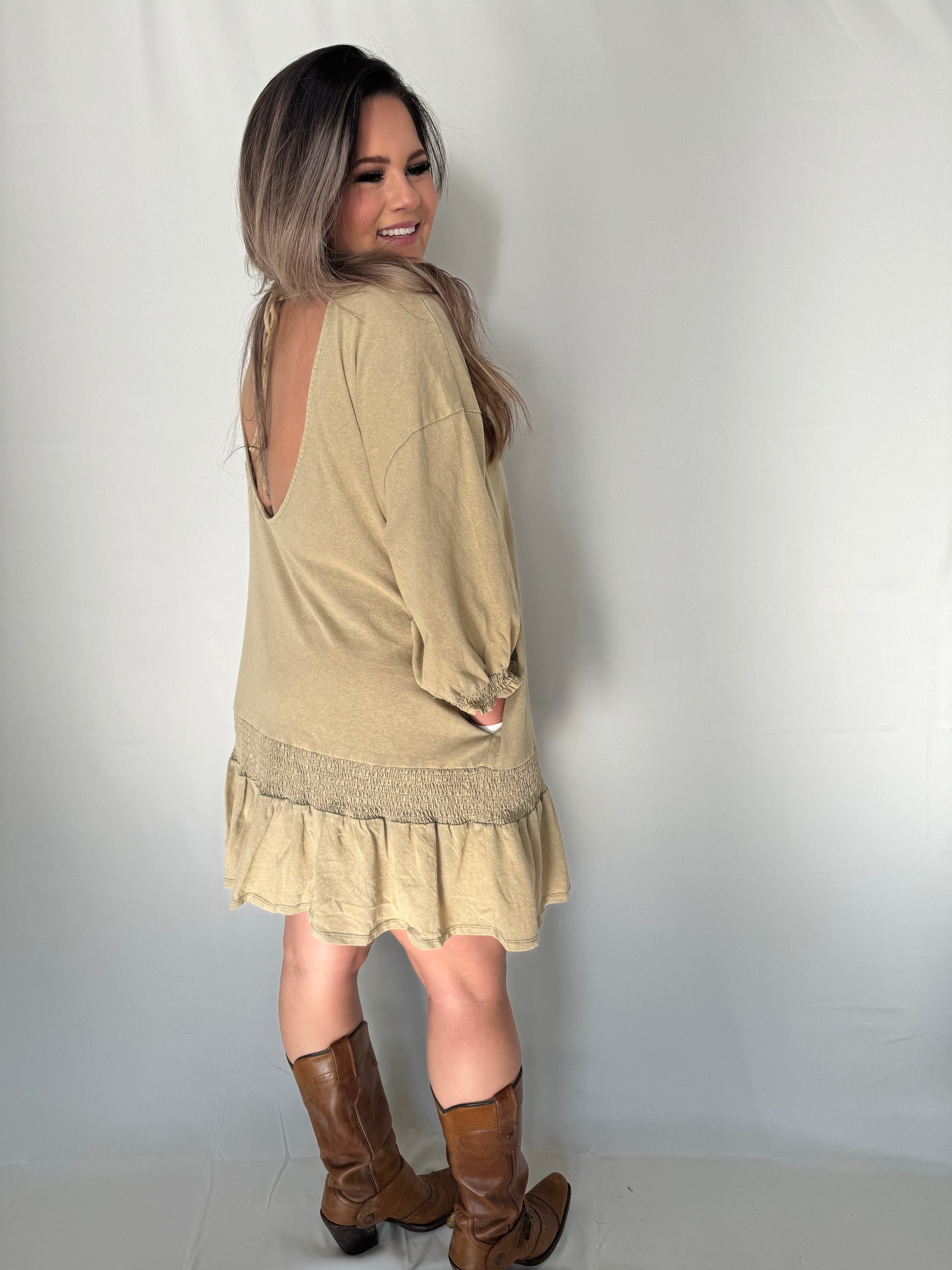 This.. Dress... has... POCKETS! Need I say more? But.. get ready to turn heads in our Smocked Low Back Dress. This trendy dress features a unique mineral wash and a low back design! The smocked detailing adds a fun touch to this beautiful piece. It ties in the back to ensure a perfect fit, and has cuffed three-quarter sleeves.